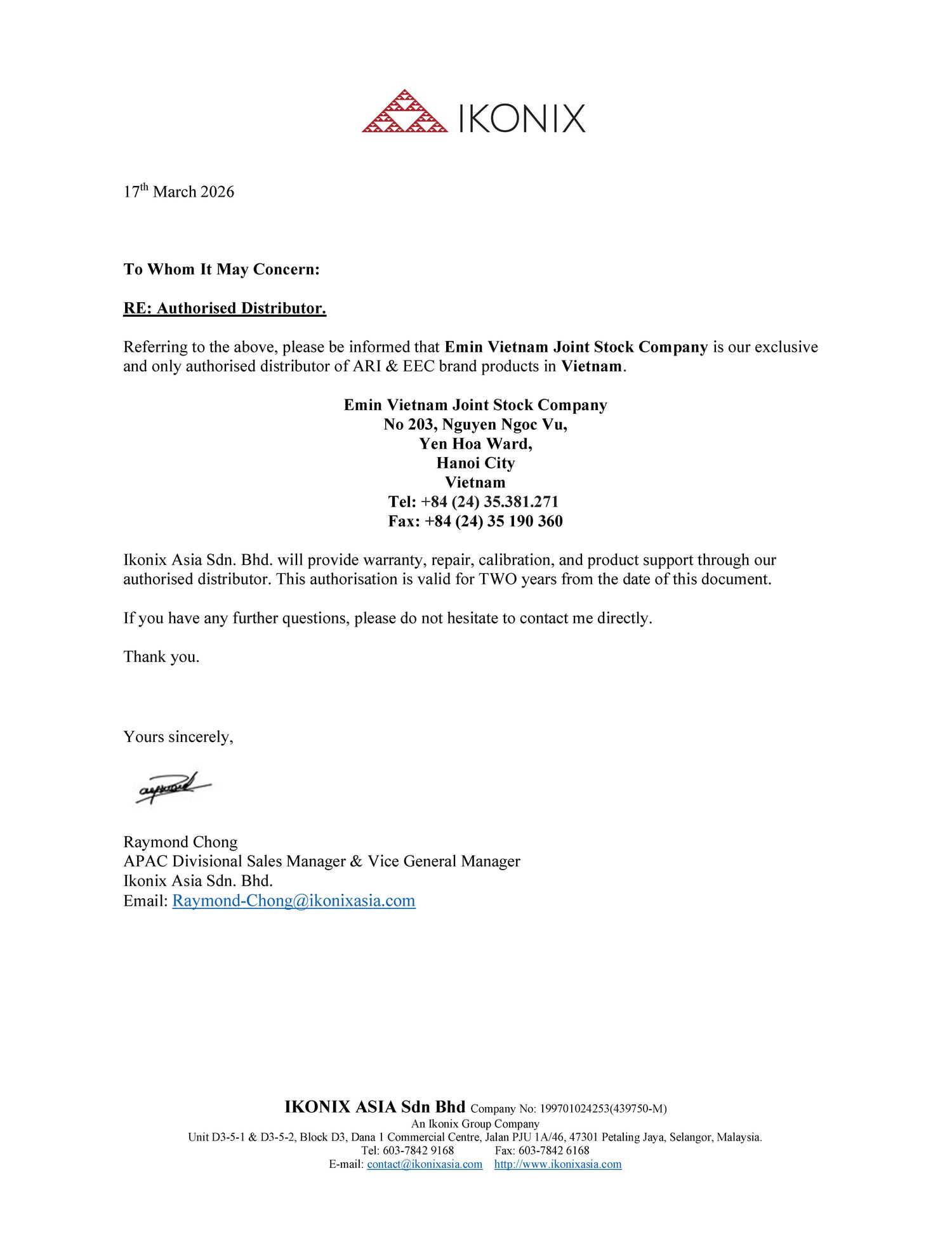 Với tư cách là đối tác phân phối của Associated Research, EMIN cam kết cung cấp sản phẩm chính hãng đầy đủ CO/CQ, đi kèm dịch vụ tư vấn kỹ thuật chuyên sâu và chế độ hậu mãi, hiệu chuẩn, bảo hành nhanh chóng chuẩn hãng. Tới nay, EMIN là đại diện phân phối của hơn 600 hãng sản xuất nổi tiếng như: Tektronix, Keysight, Chauvin-Arnoux, GW Instek, Hioki…